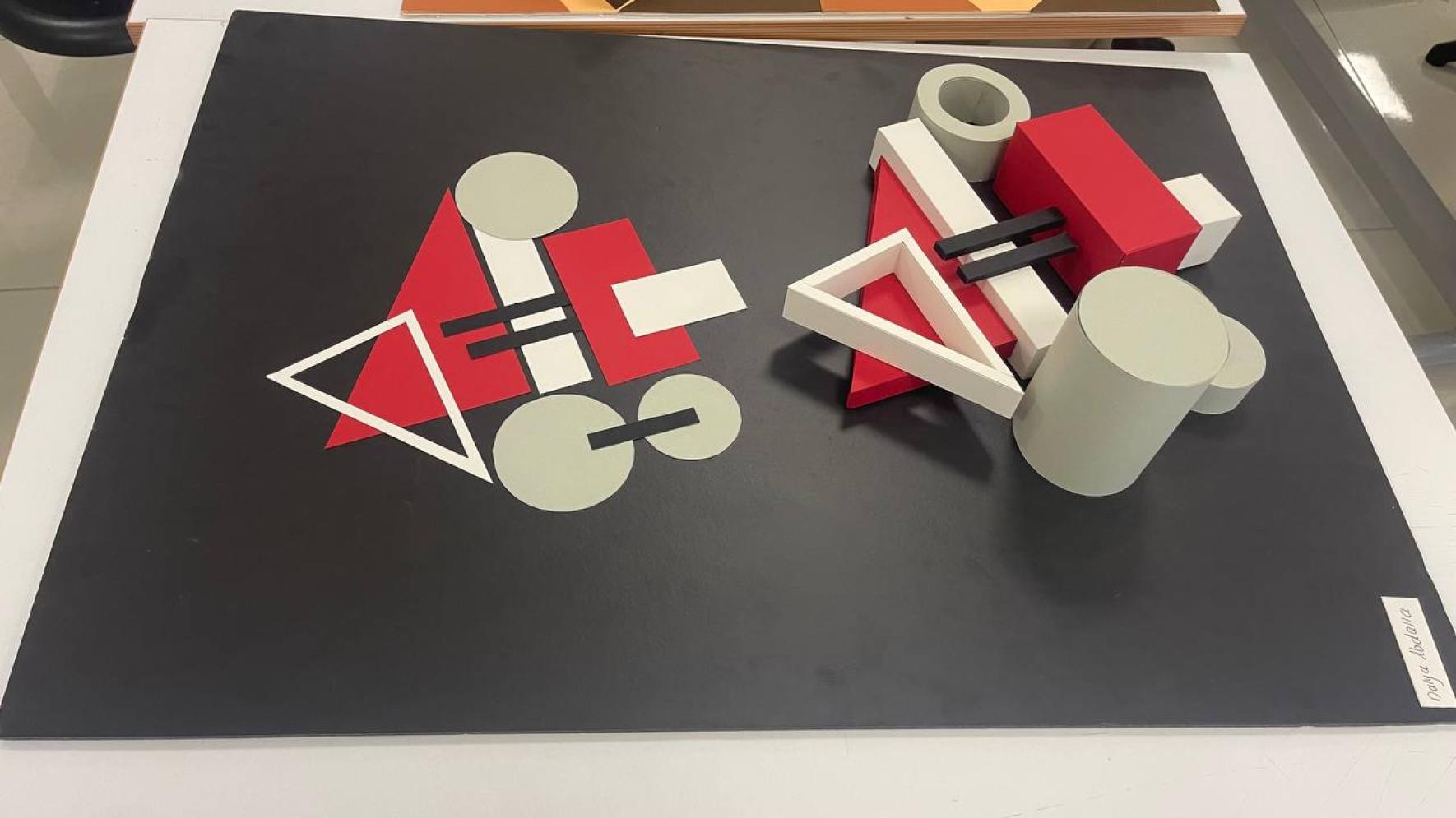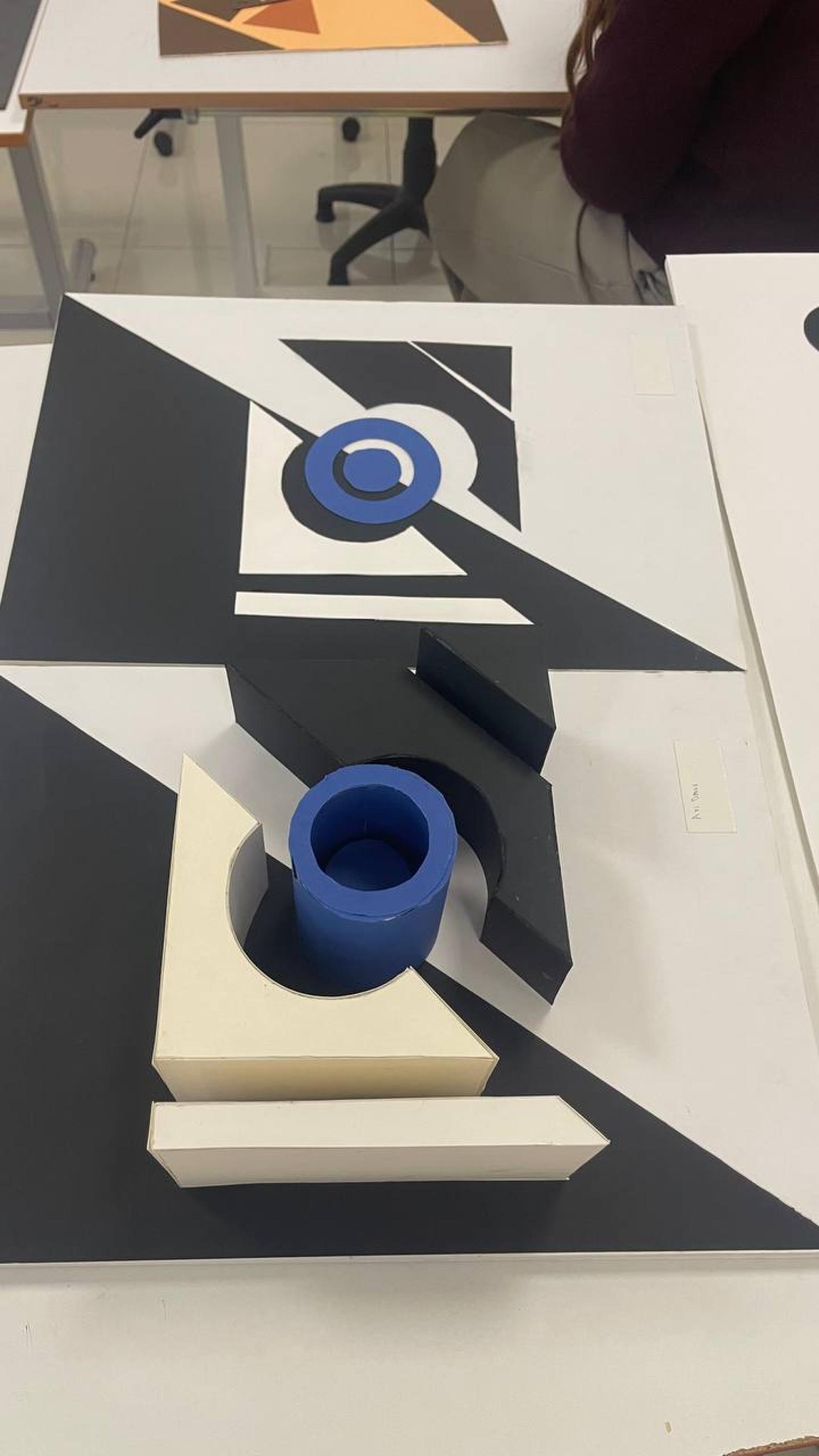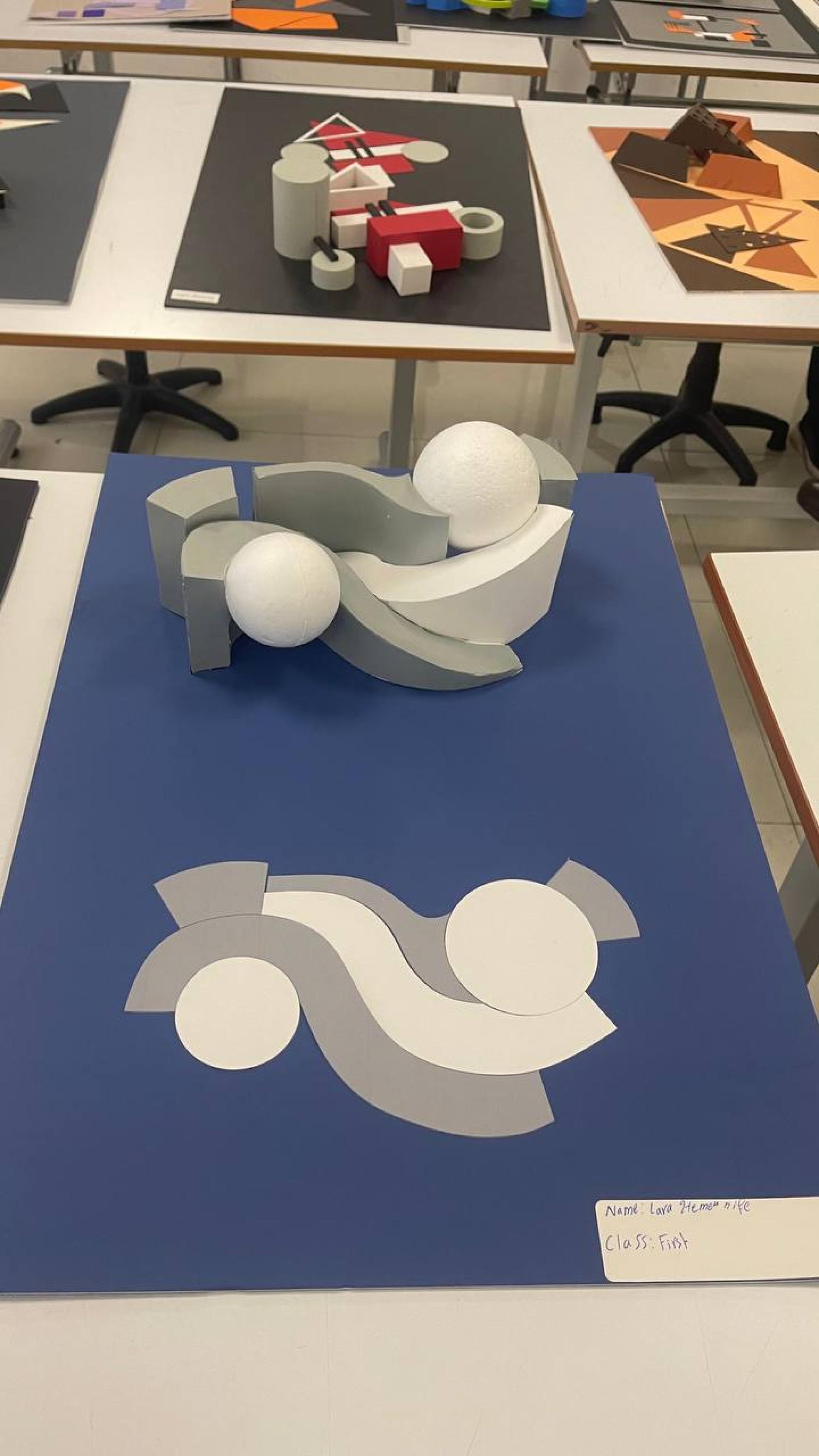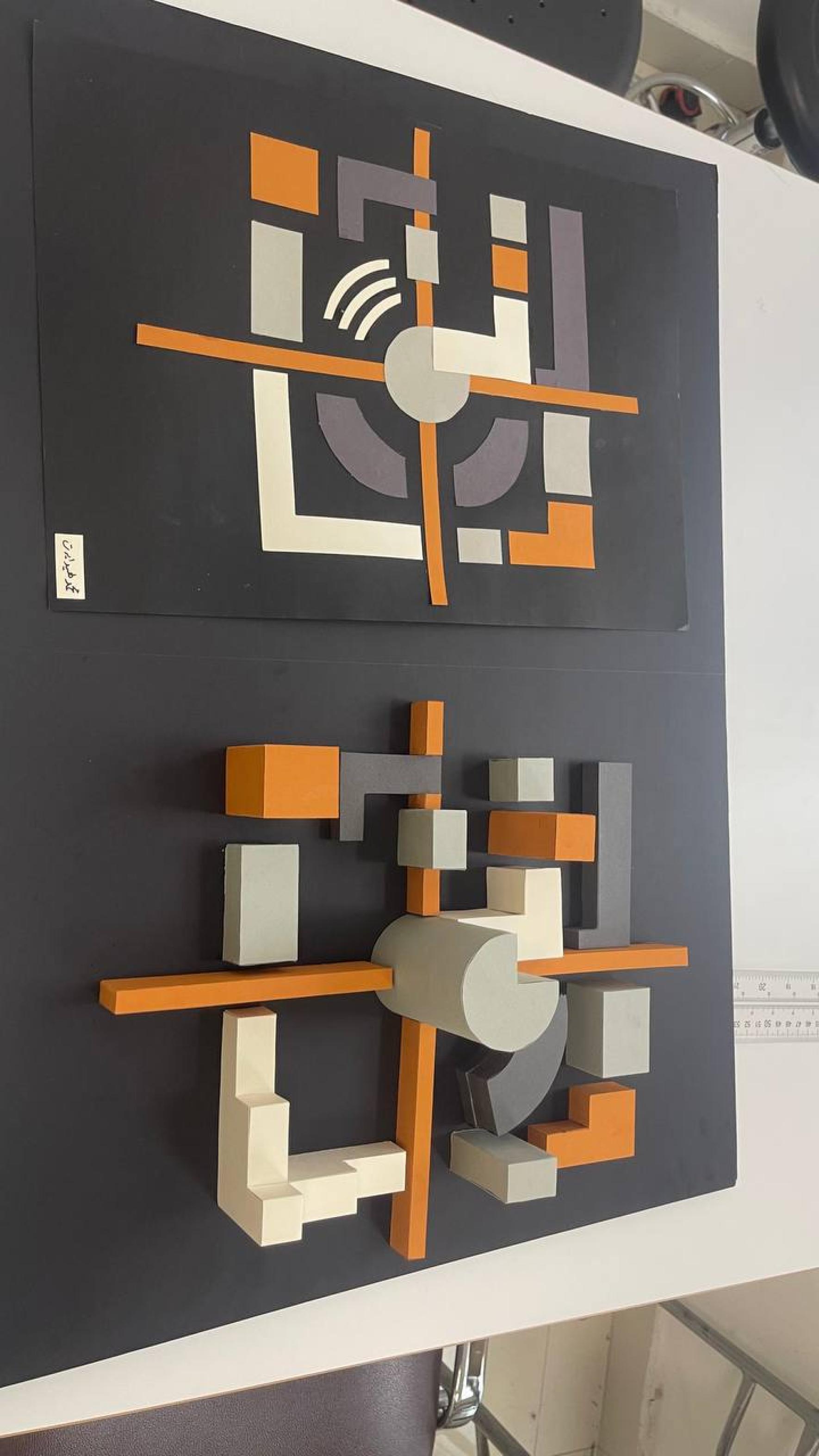 بەشێک لە کاری فێرخوازانی بەشی ئەندازیاری دیکۆری ناوەوە، سمستەری یەکەم لە وانەی پرنسپڵەکانی هونەر و دیزاینی ناوەوە، پرۆژەی کۆمپۆزشنی سێ دووری، بە سەرپەرشتی مامۆستایانی وانە م. لانە ڕۆشن، م. تابلۆ خالید و م.ڤینا شەوکەت.
