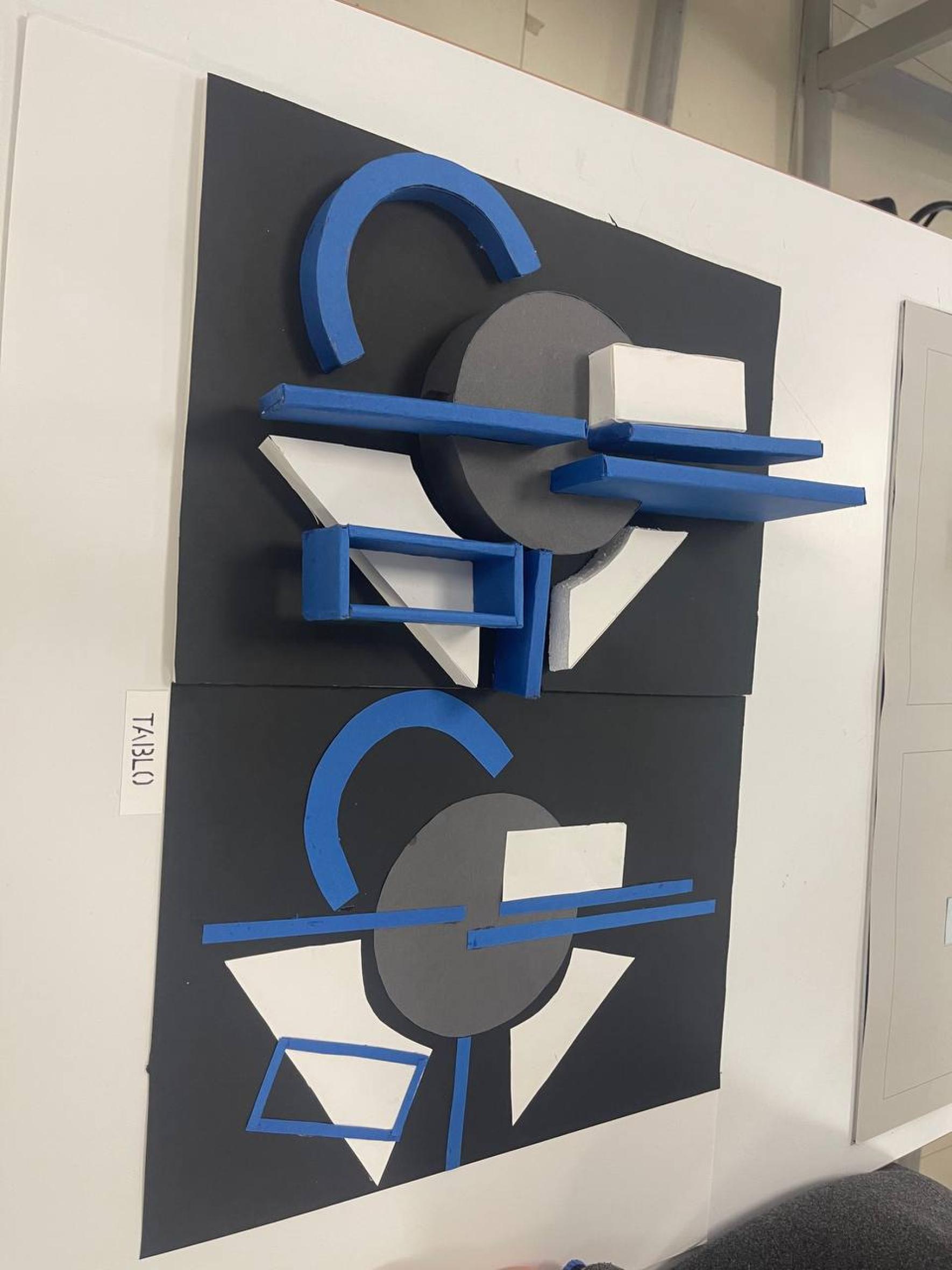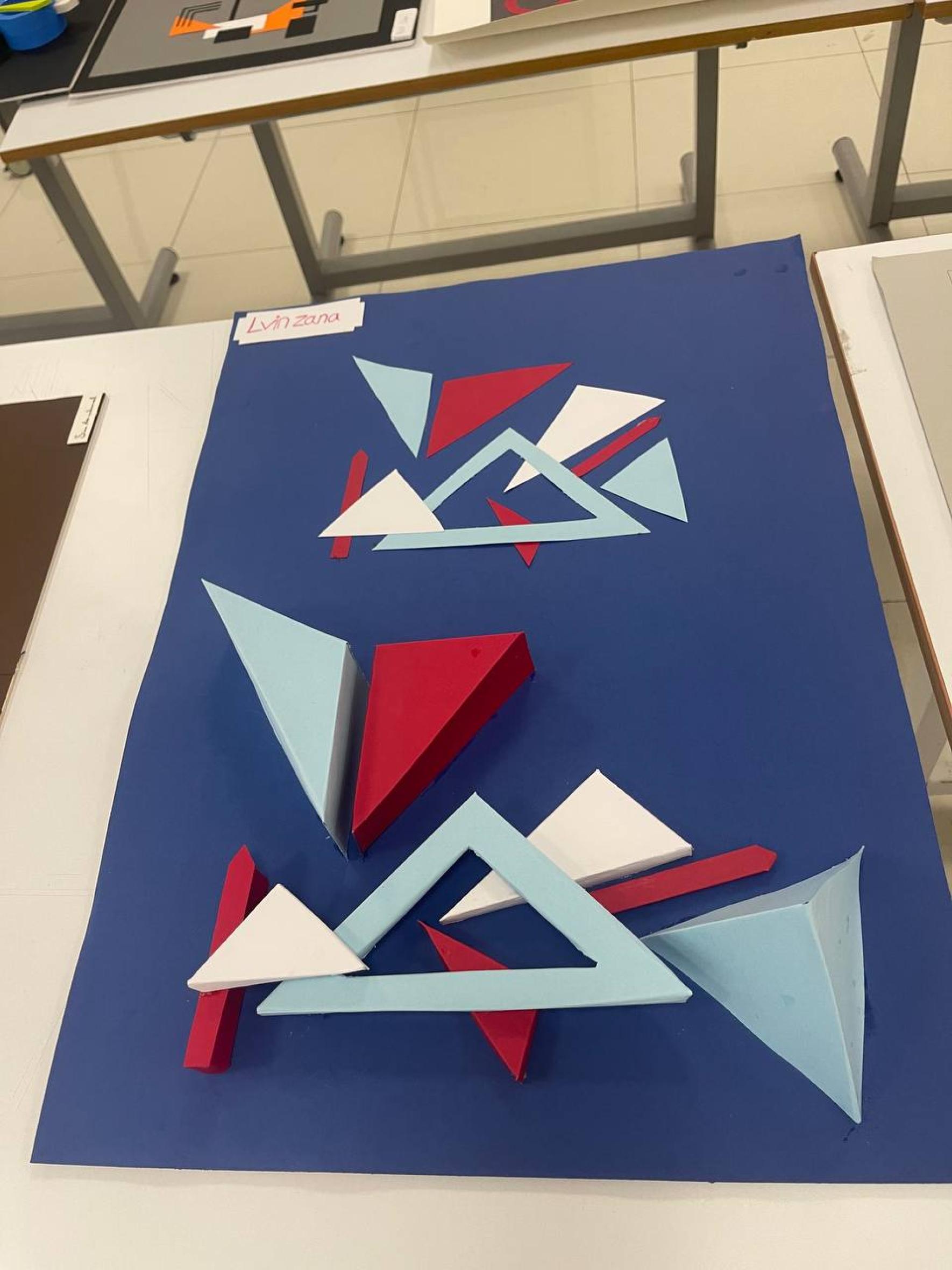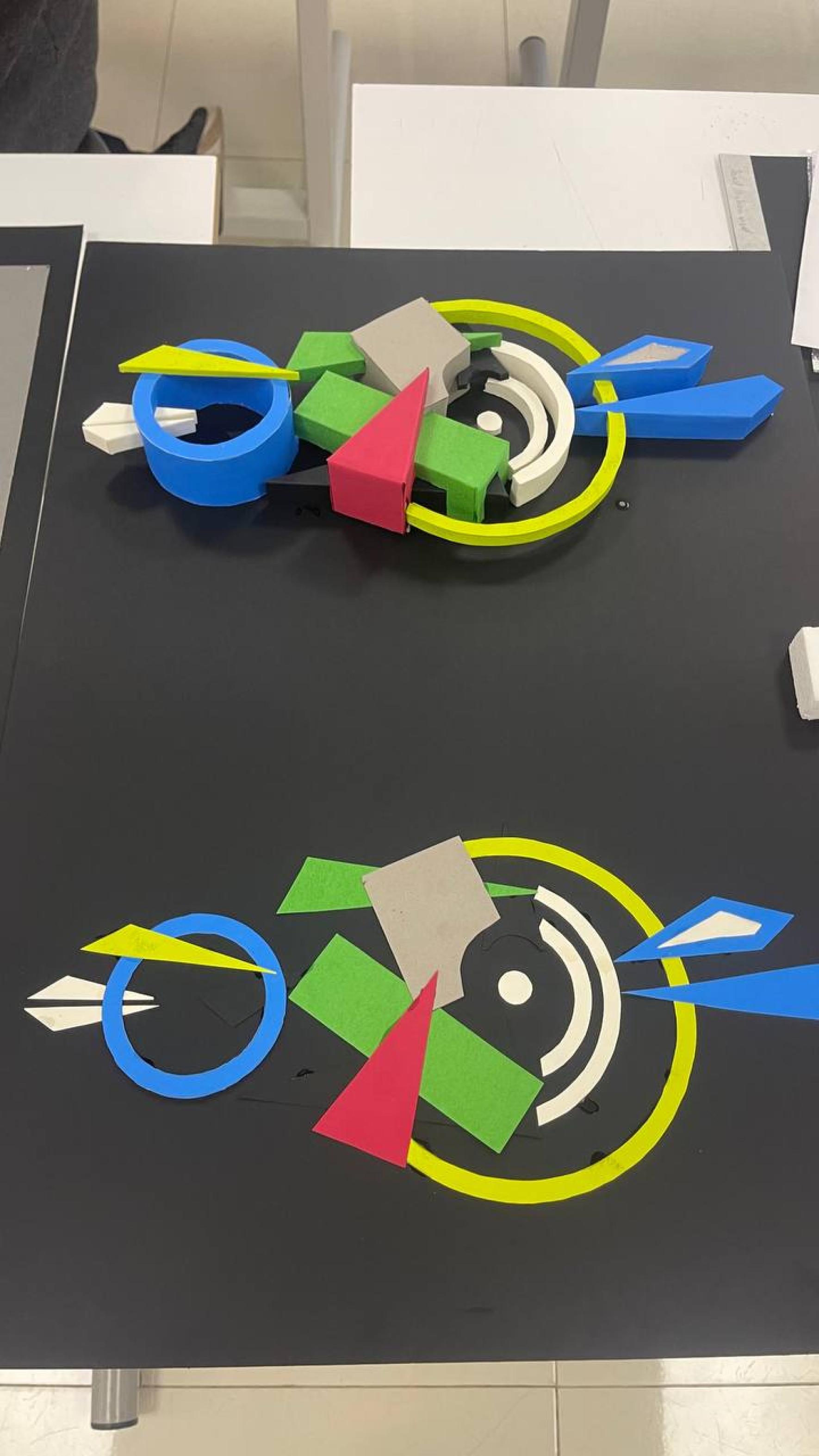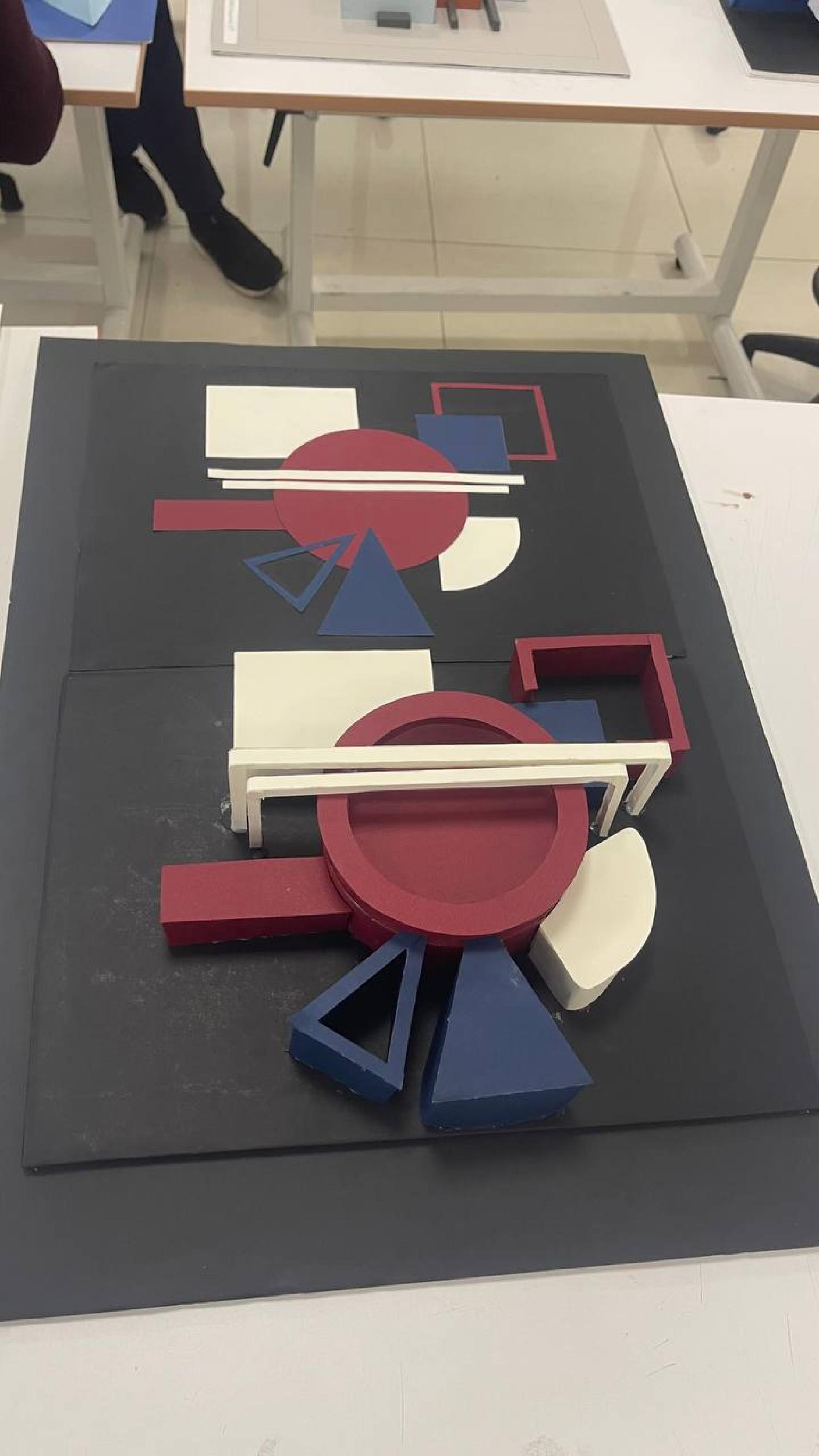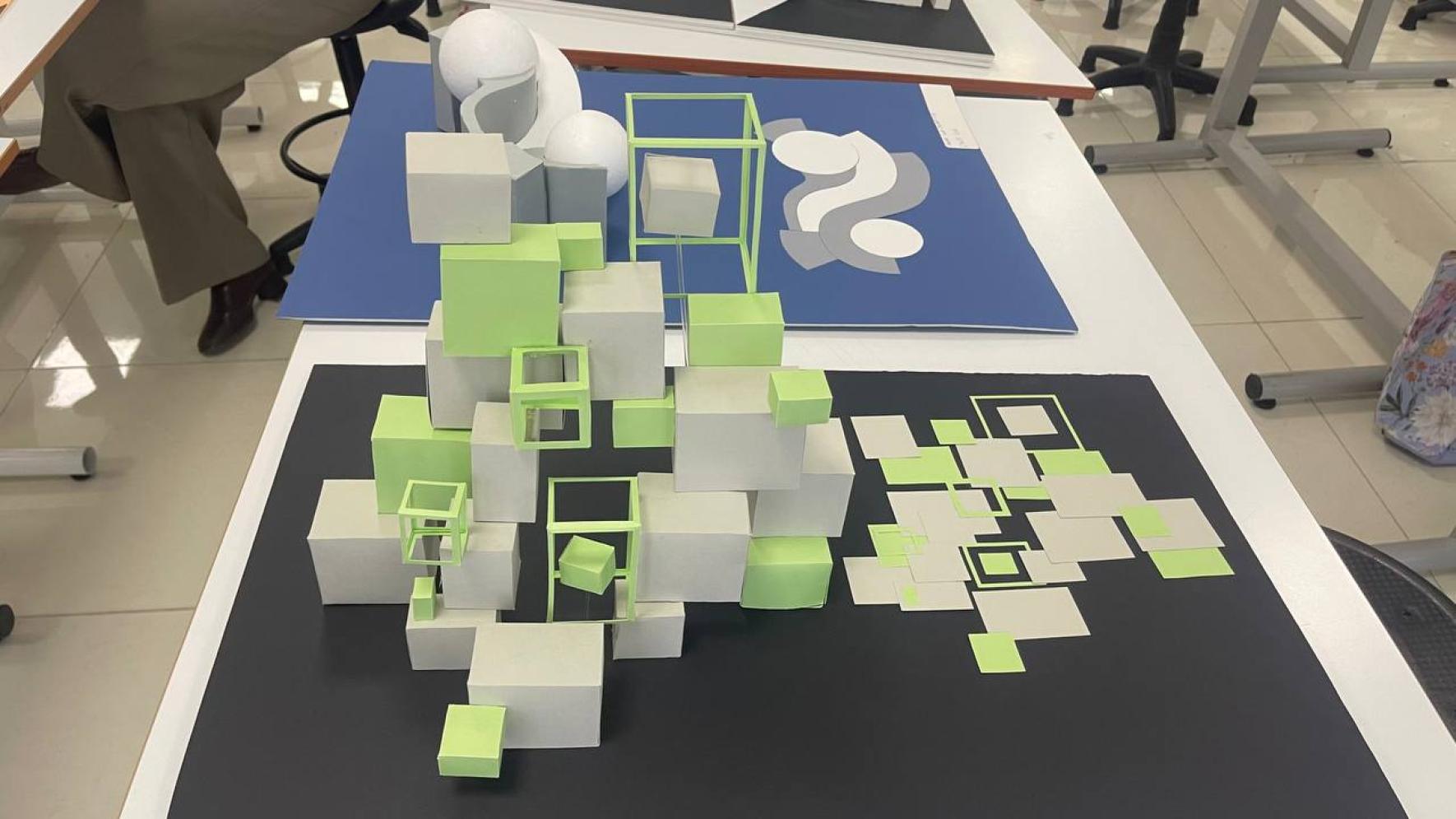 بەشێک لە کاری فێرخوازانی بەشی ئەندازیاری دیکۆری ناوەوە، سمستەری یەکەم لە وانەی پرنسپڵەکانی هونەر و دیزاینی ناوەوە، پرۆژەی کۆمپۆزشنی سێ دووری، بە سەرپەرشتی مامۆستایانی وانە م. لانە ڕۆشن، م. تابلۆ خالید و م.ڤینا شەوکەت.